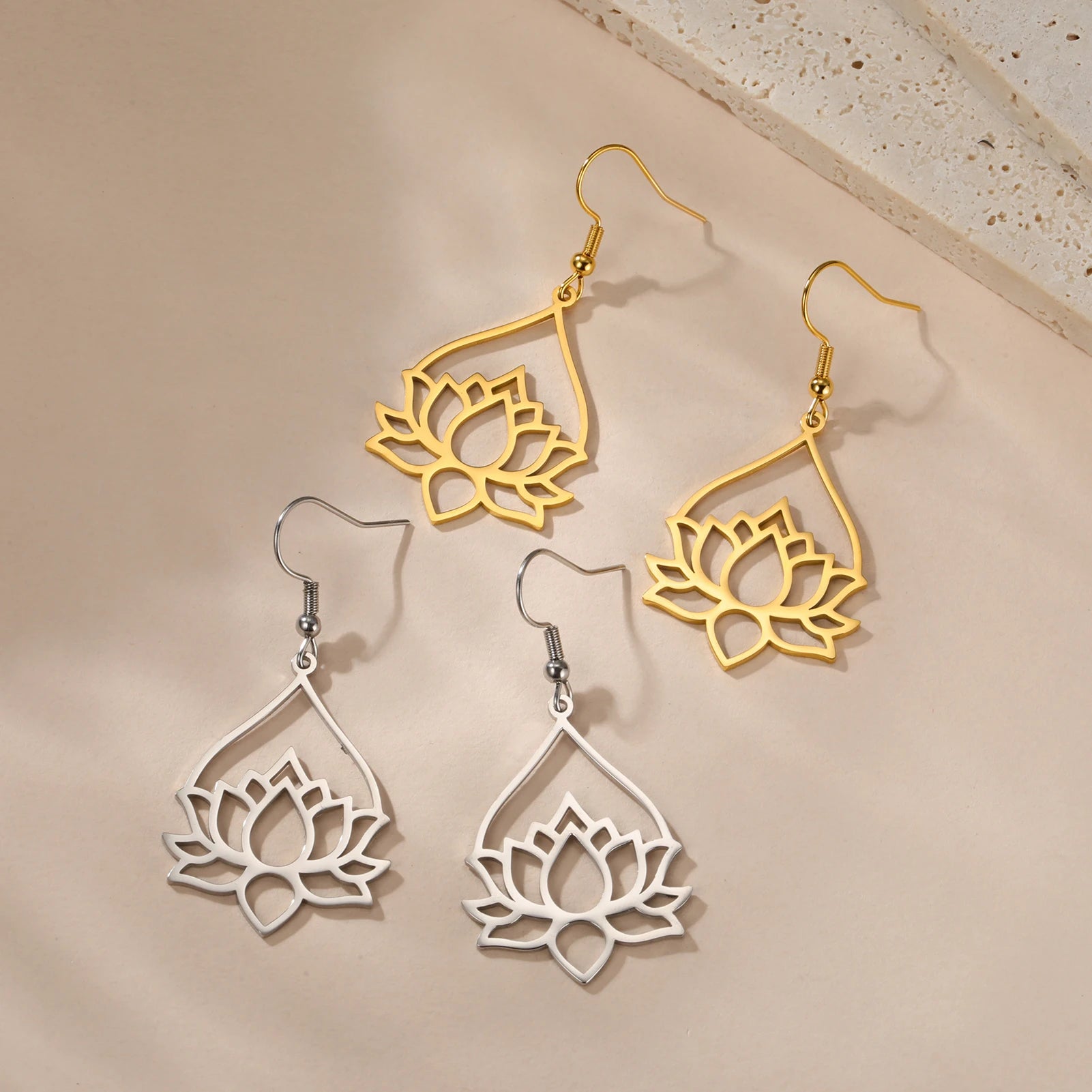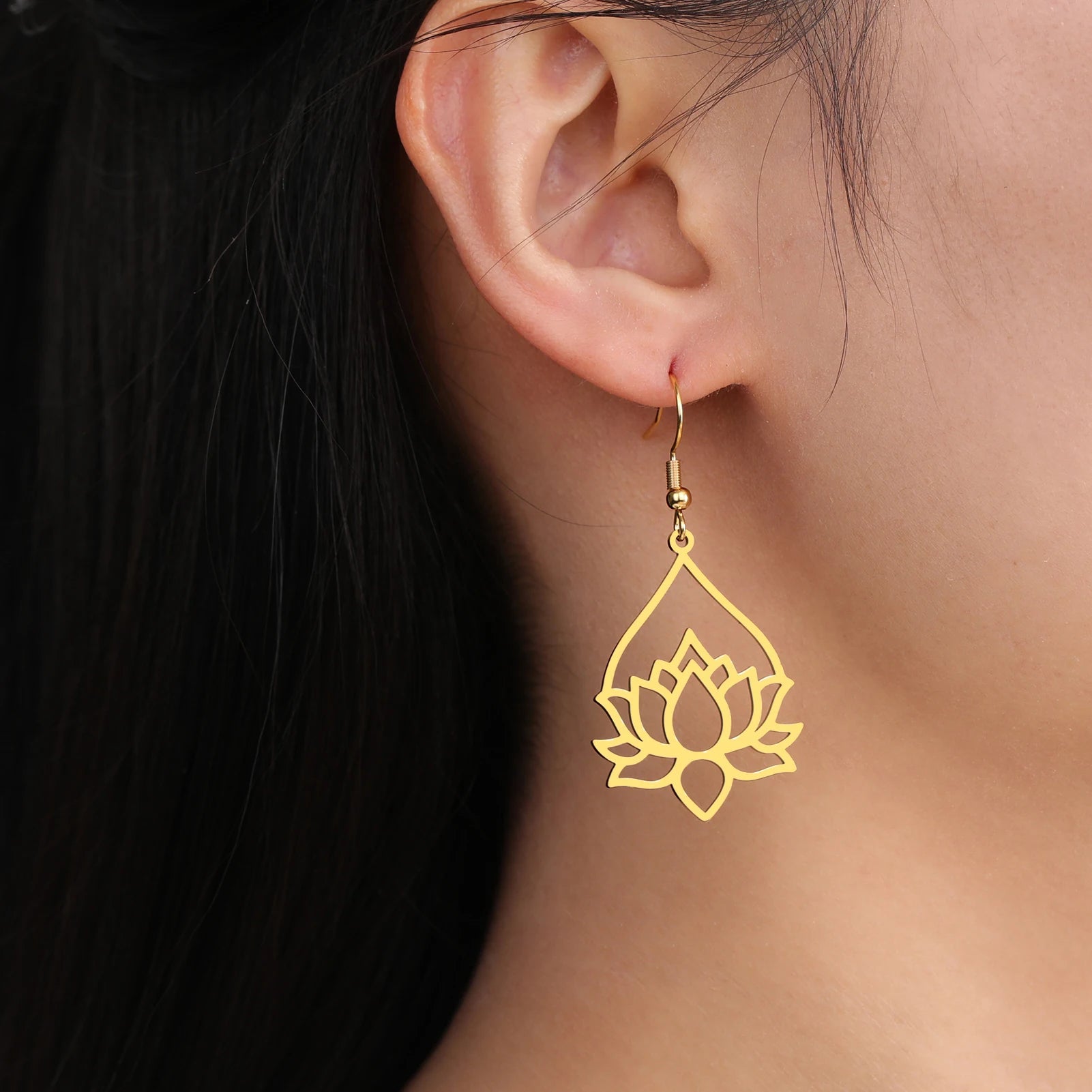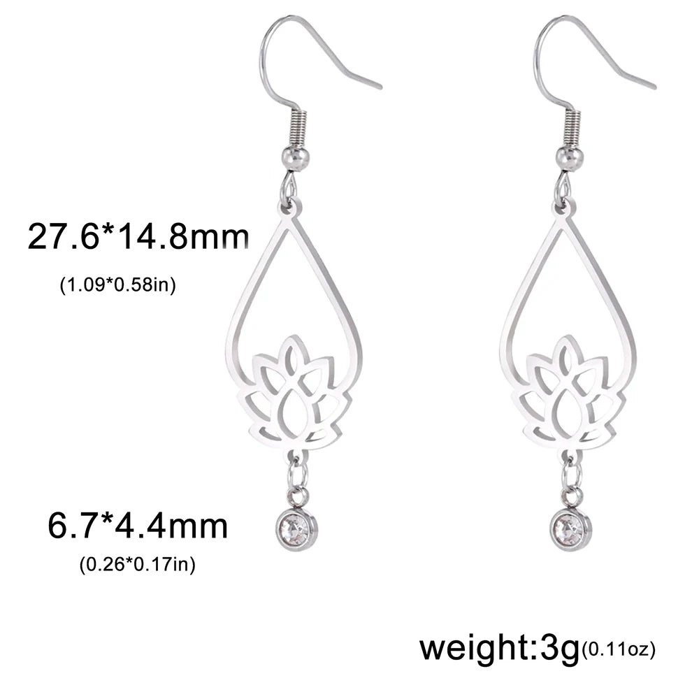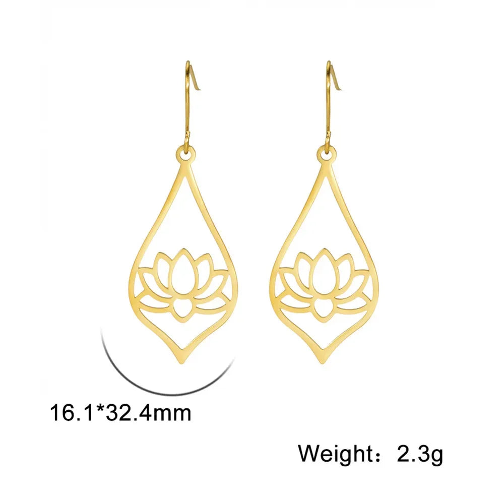 Skyrim Lotus Flower Rhinestone Dangle Earrings - Gold Stainless Steel Bohemian Jewelry for Women