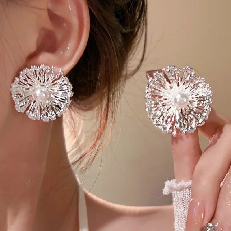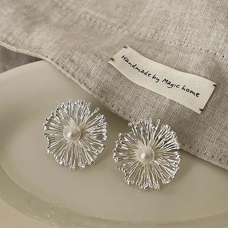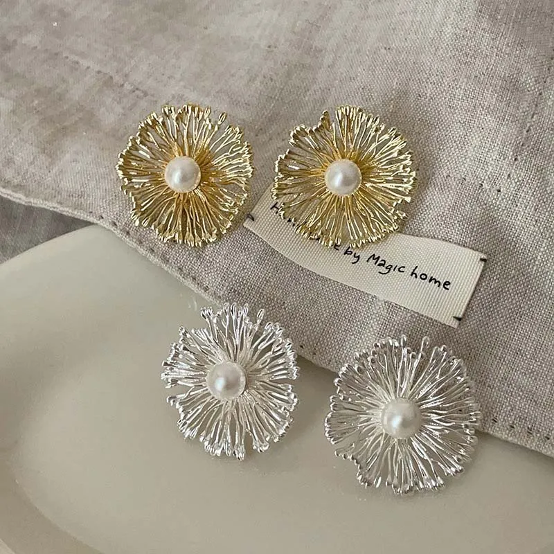 Exaggerated Metal Flowers Pearl Stud Earrings – Fashion Jewelry Gifts for Women