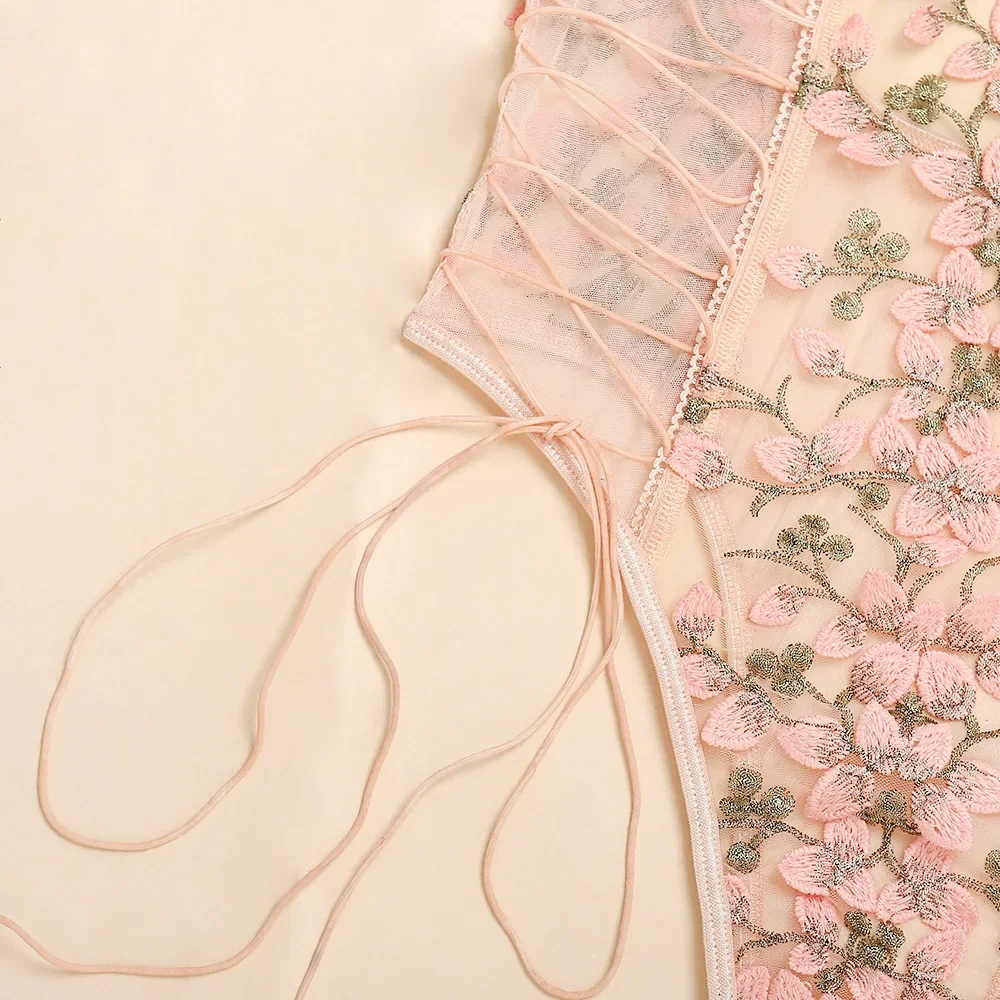 Floral Embroidery Lace See-Through Bodysuit - Elegant Lace-Up Lingerie Romper for Women