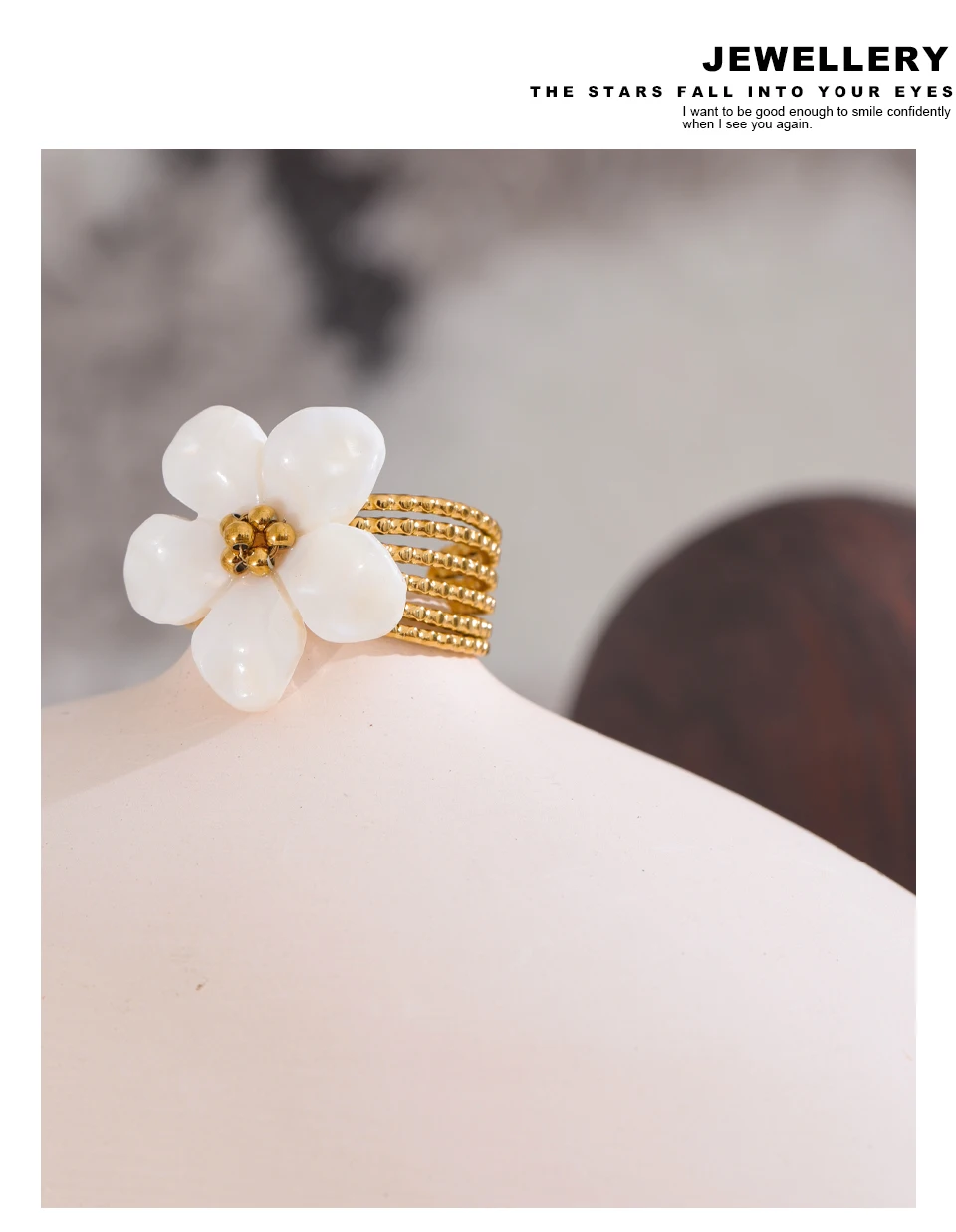 Yhpup Thicker Natural Shell Flower Open Gold Color Ring - Fashion Stainless Steel Waterproof Jewelry