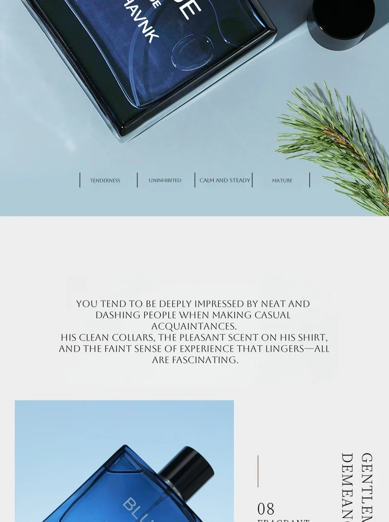 Crafted for those who appreciate the finer things in life, this cologne seamlessly integrates into your daily routine, whether you're heading to an important meeting, a casual outing, or a romantic dinner. A spritz of Charm Blue enhances your presence, leaving a lasting impression wherever you go.
