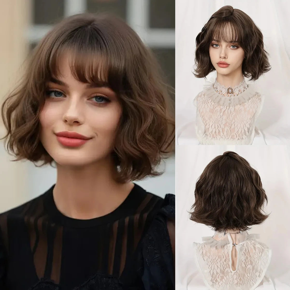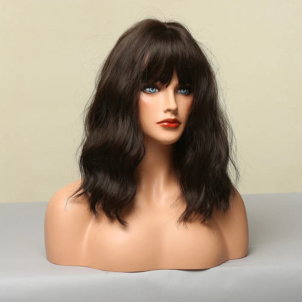 EASIHAIR Dark Brown Wavy Bob Wig with Bangs - Synthetic Heat Resistant Medium Length Wig for Women