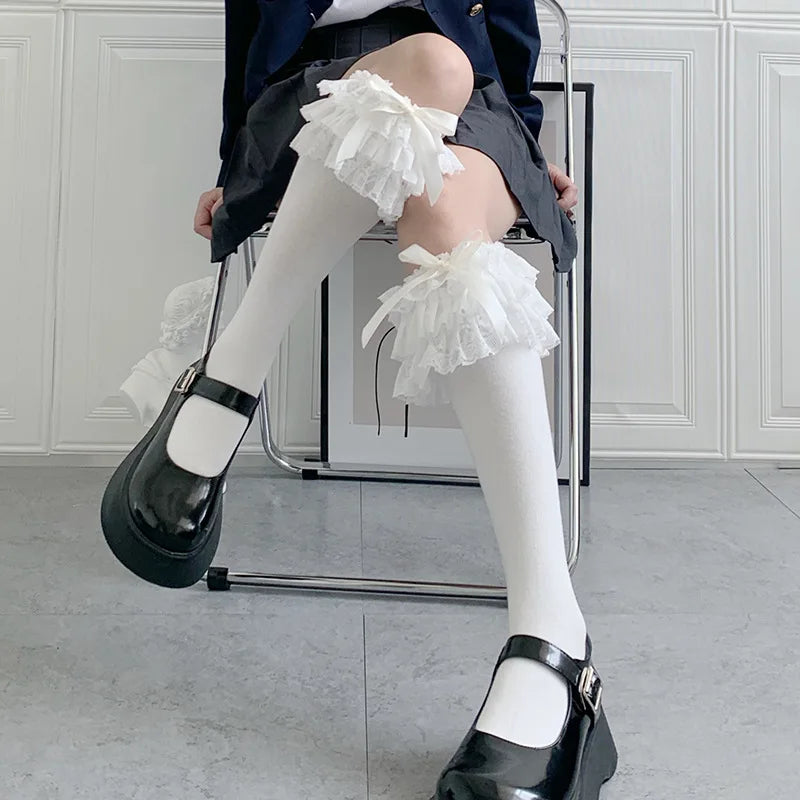 Lolita Nylon Lace Knee High Socks with Bow Knot - Cute Cartoon Princess Design
