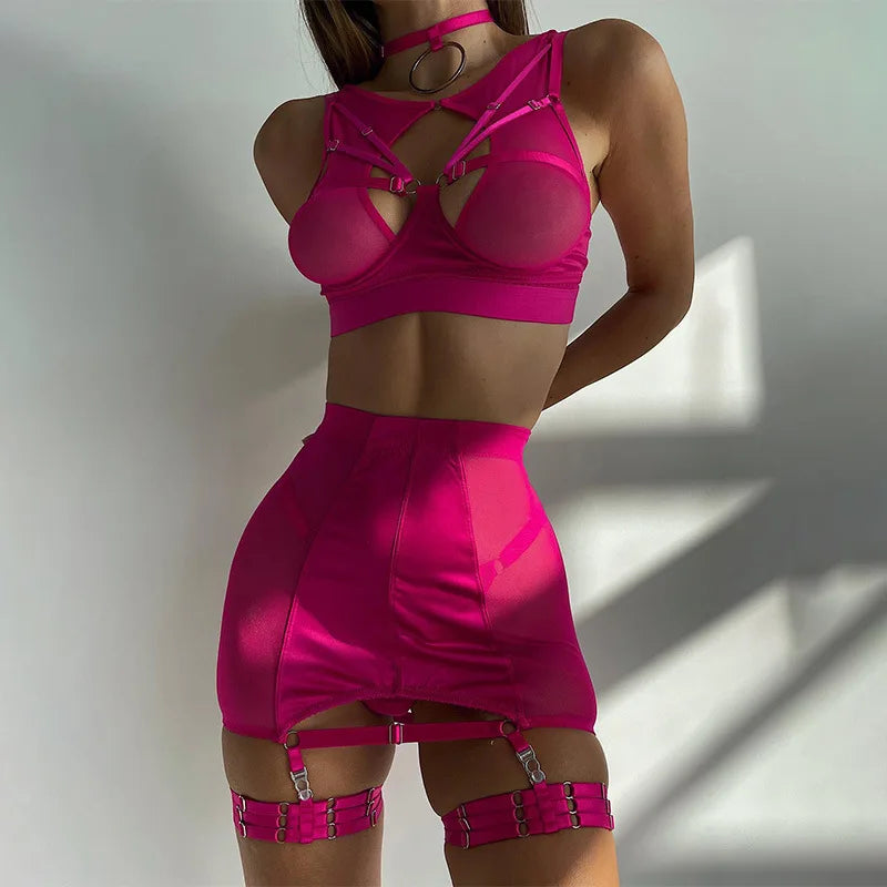 Step into a world of allure and enchantment with our 5-Piece Mesh Lingerie Set in striking black and red. This exquisite ensemble is designed for the modern femme fatale who isn't afraid to embrace her gothic side. Imagine slipping into this stunning set, feeling the soft mesh against your skin, as you prepare for a captivating evening.
